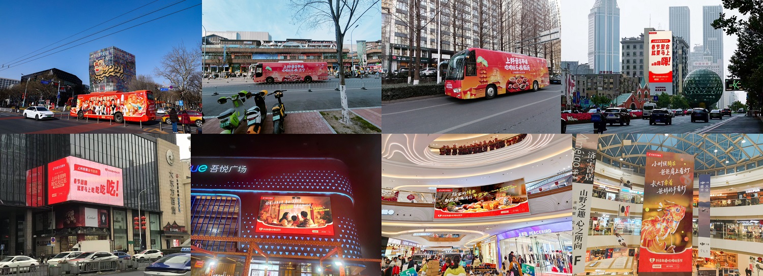 为了让这份热闹从指尖延伸到街头,满载温情的巡游大巴在北区9个城市同步启程。商家老板的群像海报化身“城市名片”,在大巴车身上穿梭于各个商圈。而在15个城市的街头,50多块地标大屏相继亮起,以“创意大字报”向全城告白。在山东,高铁站附近商圈的16块巨幅大屏,让归乡人在踏入家乡的第一秒,就撞见久违的烟火气。