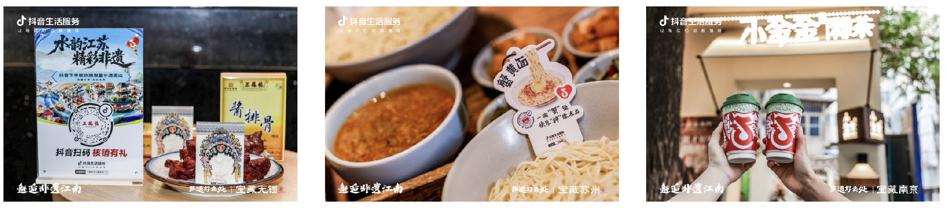 而线下活动相关物料的落地,成为多元角色价值聚变的“最后一公里”终端。活动聚焦非遗元素与消费场景的深度融合,实现商家供给、达人种草与用户体验的闭环承接。江苏“昆曲”主题扫码物料借由核销有礼机制,推动交易上翻与心智渗透;南京盐水鸭、苏州蟹面、无锡酱排骨等原型随餐小香片,以轻量化引导促进体验感与转化率双提升;剪纸元素杯托更突破品类边界,将赋能从非遗餐品延伸至多品类商户。一系列巧思让非遗消费的价值链路完整贯通、扎实落地。